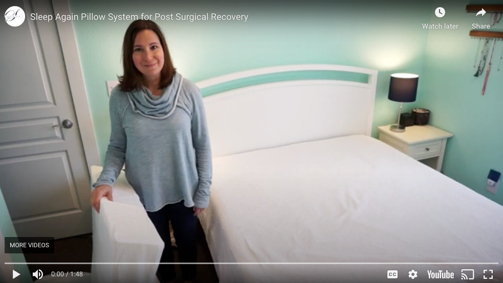 The Sleep Again Pillow System was created by a breast cancer survivor, specifically with mastectomy recovery i mind. Patients healing from a mastectomy are instructed to sleep on their back in an elevated position for several weeks after surgery. This is true for many surgeries, but it’s especially important for breast surgery because the elevation both reduces swelling and pain while also increasing circulation. Our system is specifically designed to secure your body in a safe and comfortable position while sleeping and resting using a unique combinations of wedges and side pillows to help prevent you from rolling over at night.