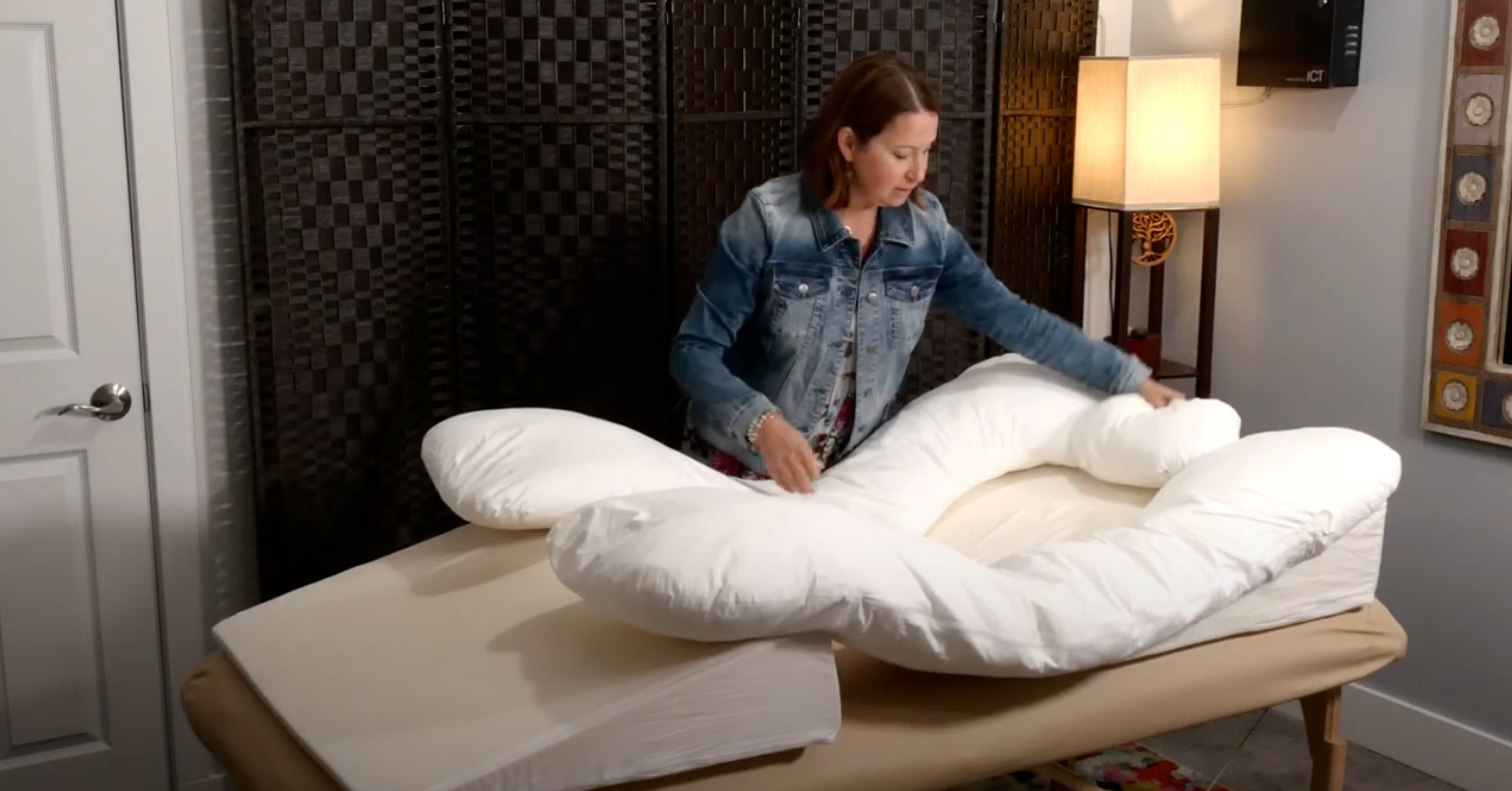 We demonstrate another setup variation of the Sleep Again Pillow System for more upper-body support or elevation.