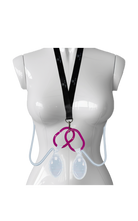 Simply slip the lanyard over your head like a necklace. Adjust the length to align with where you want the drain bulbs to rest, ensuring the drain tubes can reach from your body to the metal clip on the bottom of the lanyard. Use one pink "C" shaped piece for each drain bulb.
